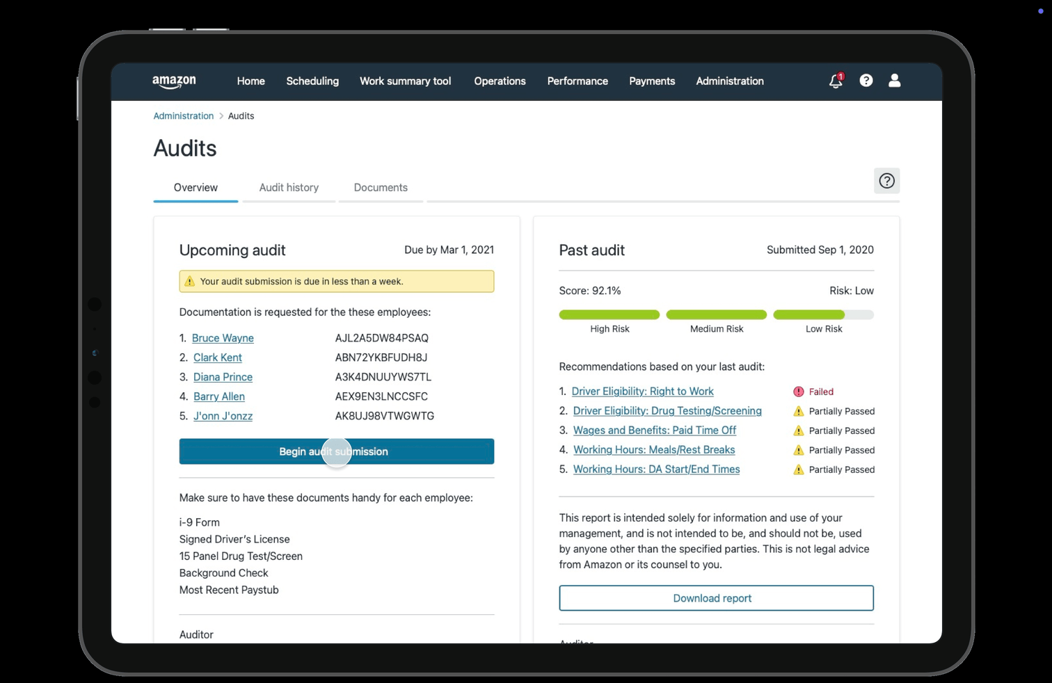 The Compliance Dashboard replaced the Excel-based audit submission process for Amazon’s Delivery Service Partners (DSPs) to make compliance more transparent, guided, and efficient. The new workflow introduced an Audit Wizard modeled after familiar software like TurboTax, breaking the audit into clear, digestible steps versus error-prone spreadsheets and outdated communications.